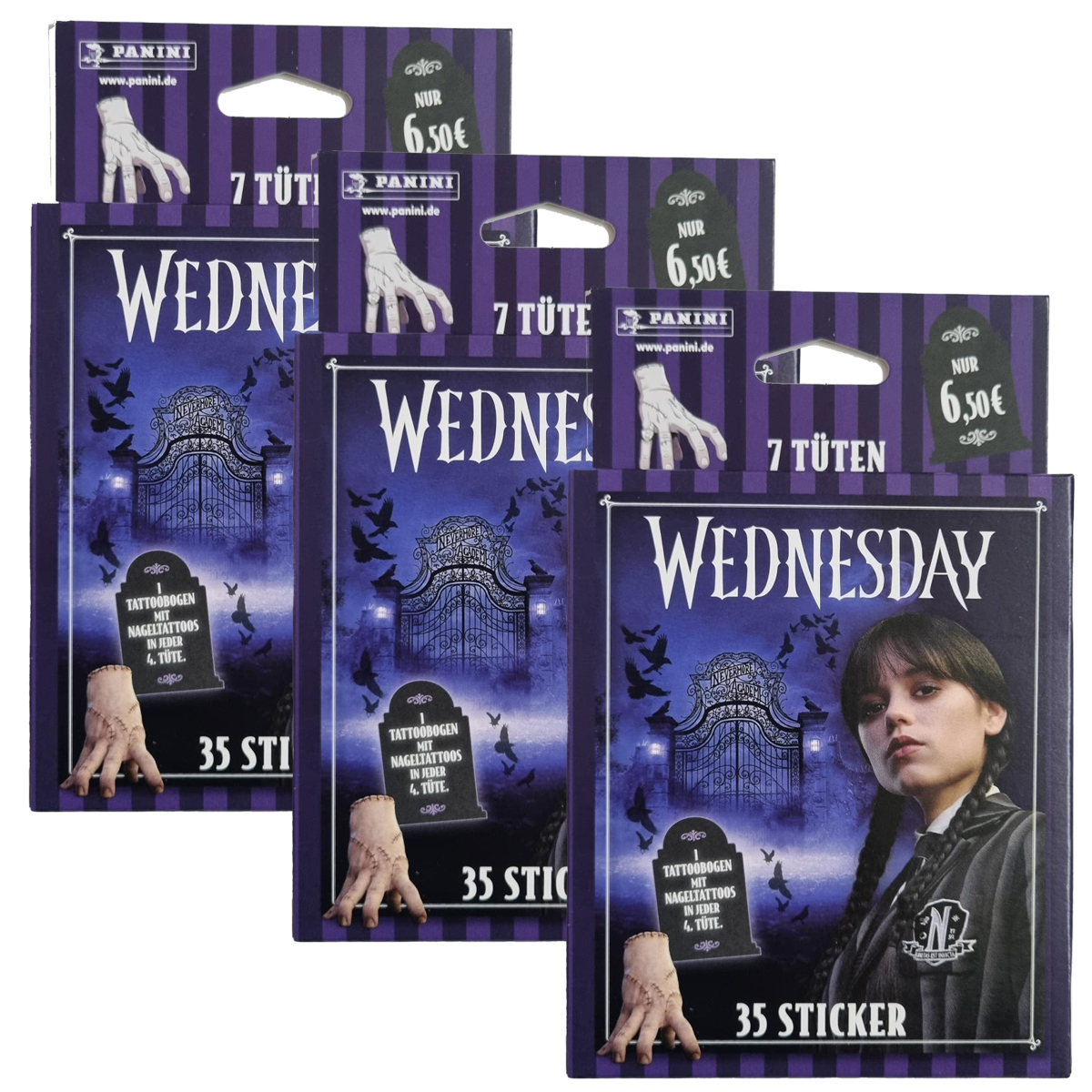 Dreifacher Sammelspaß für Wednesday-Fans! Mit diesem 3er-Pack der Panini Wednesday 2 Sticker Eco Blister bekommst du insgesamt 105 Sticker und 3 Nageltattoos zur Netflix-Serie „Wednesday – Rückkehr an die Nevermore Academy“. Statt 19,50 € UVP jetzt nur 18,99 € – perfektes Preis-Leistungs-Verhältnis für Sammler!