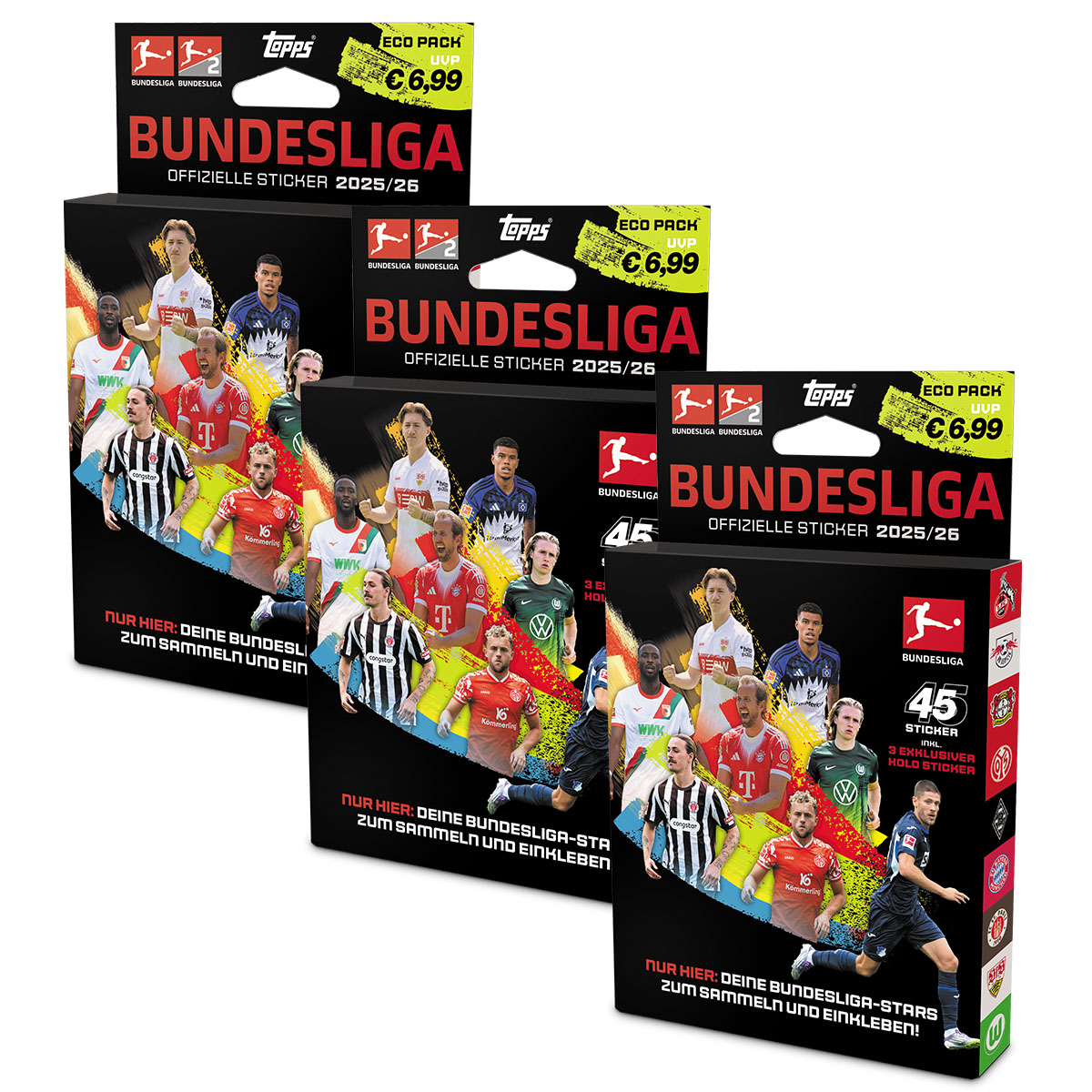 Mit dem Topps Bundesliga Sticker 2025/26 3 Eco Packs Bundle erhältst du das perfekte Sammlerset für Fans,