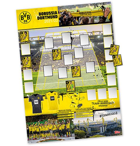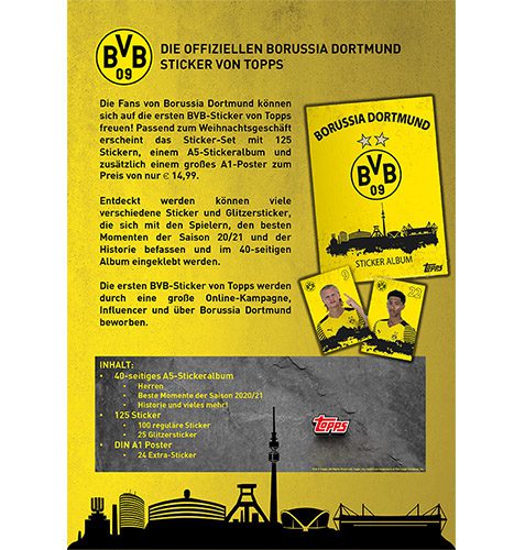 Topps BVB Offizielles Sticker-Set 2021/2022 Sie erhalten – 1x Sticker-Set 2021/2022 Inhalt : 1x A5 Sammelalbum + 149 Sticker + 1x Poster Die Fans von Borussia Dortmund können sich auf die ersten BVB-Sticker von Topps freuen! Passend zum Weihnachtsgeschäft erscheint das Sticker-Set mit 125 Stickern, einem A5-Stickeralbum und zusätzlich einem großes A1-Poster. Entdeckt werden können viele verschiedene Sticker und Glitzersticker, die sich mit den Spielern, den besten Momenten der Saison 20/21 und der Historie befassen und im 40-seitigen Album eingeklebt werden. Die ersten BVB-Sticker von Topps werden durch eine große Online-Kampagne, Influencer und über Borussia Dortmund beworben. Alles zum BVB…