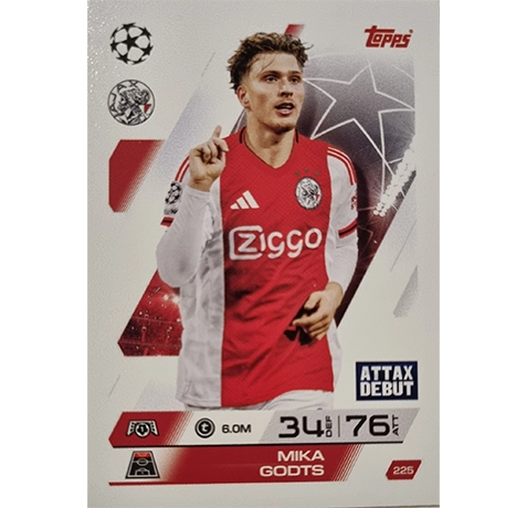 Diese Karte zeigt das Topps Match Attax Champions League 2025/26 KARTE 225 MIKA GODTS – ein Muss für alle Sammler, Fans und Komplettisten der beliebten Match Attax Serie.