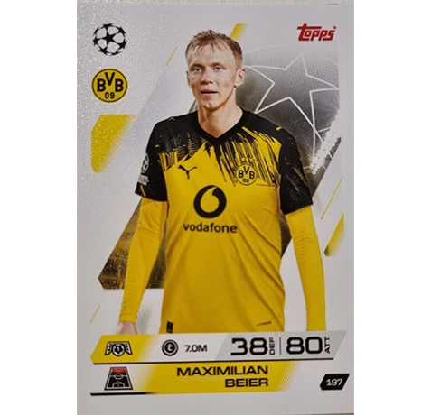 Diese Karte zeigt das Topps Match Attax Champions League 2025/26 KARTE 197 MAXIMILIAN BEIER– ein Muss für alle Sammler, Fans und Komplettisten der beliebten Match Attax Serie.