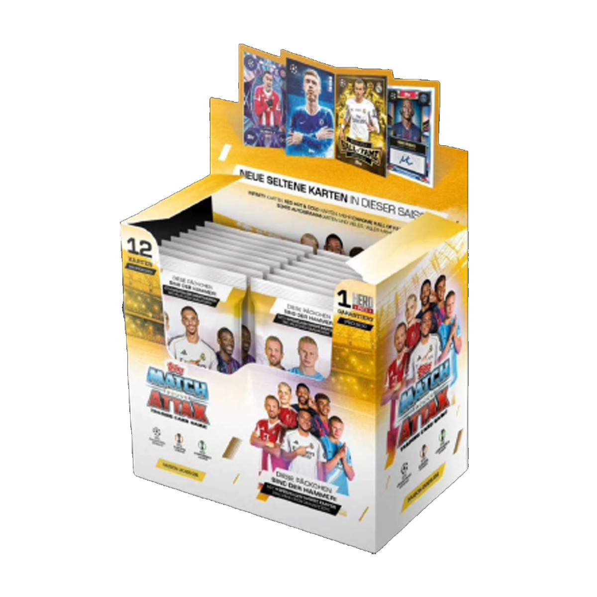 Hinweis: In fast jedem Match Attax CL Display 2025/26 steckt wieder ein sogenanntes Hero Pack – ein Booster mit besonders starkem Inhalt wie Spezialkarten oder Karten mit Seltenheitswert. Offiziell noch nicht bestätigt, aber wie in den Vorjahren sehr wahrscheinlich.
