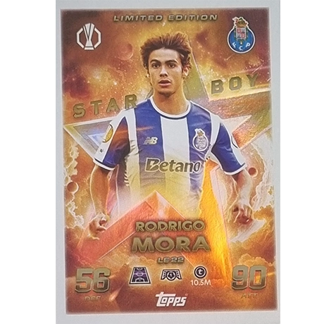 Die Topps Match Attax Champions League 2025/26 Limited Edition Karte LE 22 Rodrigo Mora ist eines der absoluten Highlights der neuen Saison. Mit exklusivem Design und hohem Sammlerwert gehört diese Karte in jede Match Attax Sammlung. Wer seine Sammlung komplettieren will, kommt an dieser LE nicht vorbei.