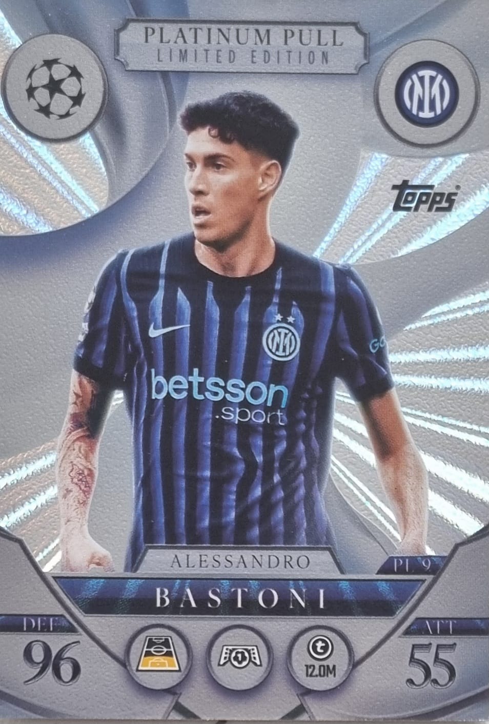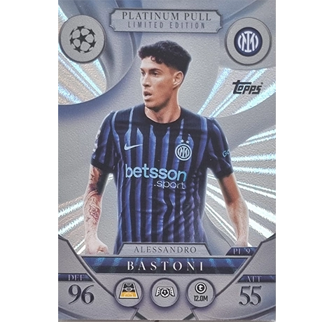 Die Topps Match Attax Champions League 2025/26 Platinum Pull Limited Edition PL 9 ALESSANDRO BASTONI ist eine der seltensten Karten der neuen Saison. Die exklusiven Platinum Pull Karten erscheinen nur ca. in jedem 28. Booster Pack und sind dadurch extrem schwer zu ziehen. Mit ihrem besonderen Design und dem italienischen Abwehrspieler Alessandro Bastoni ist sie ein echtes Highlight für Sammler.